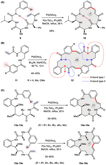 The helix–turn–helix (HTH) motif is instrumental to many DNA-binding proteins such as transcription factors that are capable of recognizing a particular DNA sequence for regulatory purposes [27]. To develop chemical probes gauging DNA–protein interactions, Iqbal et al. designed cyclic peptides bridged by a meta benzene ring such as 10 (Figure 2A) [28]. As the final step of their synthesis, acyclic substrate 9 was treated with Pd(OAc)2, tri(o-tolyl)phosphine, and diisopropylethylamine in refluxing acetonitrile for 36 h. The product 10 was isolated solely as an E-isomer in a 39% yield. Since NMR spectroscopy detected the presence of hydrogen bonds (marked as dashed lines in Figure 2A) in both the linear precursor and its corresponding product, conformational preorganization through such intramolecular hydrogen bonding was believed to promote cyclization.