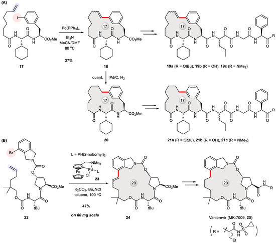 Another pertinent example appeared in 2011 when process chemists at Merck disclosed their first-generation scale-up route to vaniprevir (25, MK-7009, shown in Figure 3B) [35], a 20-membered P2–P4 macrocyclic inhibitor of HCV NS3/4a protease [36]. To support clinical development, its practical synthesis was worked out to optimize macrocycle formation. A variety of ring-closing methods were evaluated in terms of robustness and cost-effectiveness, including ring-closing metathesis, Pd-catalyzed macrocyclization, and macrolactamization. Among three Pd-catalyzed cross-couplings tested, the Heck reaction utilizing a hindered ferrocene-based palladacycle 23 stood out with the highest yield (47%) on a 60 mg scale. By contrast, the Suzuki and Sonogashira reactions with their corresponding substrates offered 5% and 35% yields, respectively. Notwithstanding a mixture of configurational and positional isomers, the ring-closed product 24 was hydrogenated and then elaborated to 25. However, the vaniprevir ring was finally closed via more efficient macrolactamization at a >10 g scale, prior to which intermolecular Heck cross-coupling took place to form the same linkage as created by the previous intramolecular Heck reaction.