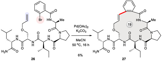 Very recently, peptide stapling through macrocyclization reactions [37,38,39] was explored by Spring et al. with a view to discovering a pan-KRAS inhibitor based on the pharmacophore model of a 13-mer peptide binding to KRASG12V. Having identified key interacting residues, they designed a library of smaller peptides whose KRAS-binding conformation as well as drug-likeness is reinforced by means of a one-component stapling strategy [40]. These linear 5- and 6-mer peptides were efficiently assembled via solid-phase peptide synthesis (SPPS) and further subjected to diverse macrocyclization reactions including azide–alkyne cycloaddition, Glaser coupling, ene–yne metathesis, cross-alkene metathesis, Heck cross-coupling, and Sonogashira cross-coupling. While Sonogashira cyclization failed to bring about any observable product, Heck cyclization (unoptimized) smoothly converted pentapeptide 26 into stapled peptide 27 in a modest yield, thus supplying adequate amount of the macrocyclic sample for in vitro biological characterization (Figure 4) [40]. Unfortunately, initial screening for KRAS-binding potency determined its IC50 value to be over 100 μM, while more active low-micromolar macrocyclic binders of KRAS were prepared alternatively via Ru-catalyzed azide–alkyne cycloaddition.