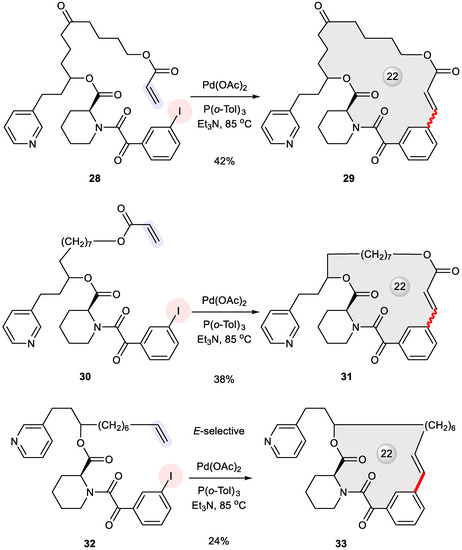 FK506 is a natural immunosuppressant featuring a 23-membered macrolide, which can be functionally dissected into two domains: one for engaging the FK506 binding protein (FKBP) and the other for downstream signal transduction [41]. To design FK506 mimics with the dual domain concept [42], Stocks et al. reserved a simplified binding domain of the parent macrocycle while replacing its effector domain with hydrocarbon tethers of varying length [43]. For example, macrocycles 29, 31, and 33 were prepared from their corresponding acyclic substrates 28, 30, and 32 through Heck macrocyclization (Figure 5) using a protocol developed by Gaudin [44]. In the case of 32, the exclusive formation of E-alkenes was observed. Dating back to 1995, this work is among the earliest examples of Heck macrocyclization.