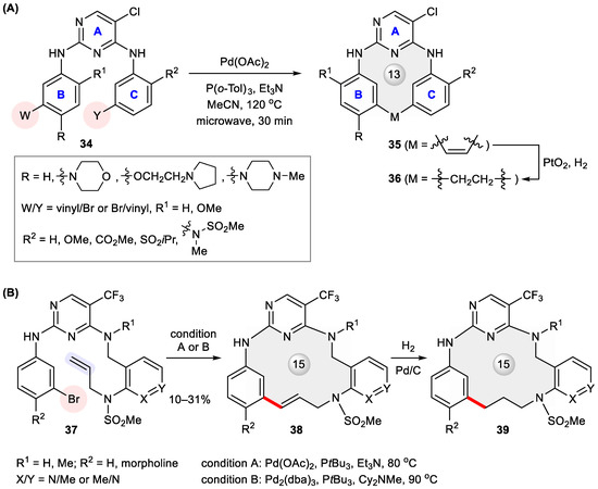 Anaplastic lymphoma kinase (ALK) is a receptor tyrosine kinase implicated in several types of cancer [45]. ALK inhibitors have proved an efficacious modality for targeted cancer therapy [46] since the launch of crizotinib in 2011 for the clinical treatment of ALK-positive non-small cell lung cancer (NSCLC) [47]. Inspired by the inverted U-shaped conformation of a 2,4-diaminopyrimidine (DAP) derivative revealed through X-ray crystallography, Breslin et al. adopted a macrocyclization strategy by designing an array of macrocyclic DAPs 36 capable of enforcing such an active conformation [48]. To access them, acyclic substrates 34 were subjected to microwave-assisted Heck cyclization. The products 35 were obtained in 32–94% yields and further converted to 36 (Figure 6A). Systematic structure–activity relationship (SAR) investigation of thus prepared macrocycles found that sp2 hybridization at the restraining two-carbon linchpin (35) tends to undermine activity relative to the saturated counterparts (36). Among them, 36c (R = 4-Me-piperazinyl, R1 = –OMe, R2 = –N(Me)SO2Me) exhibited the highest in vitro activity at both enzymatic and cellular levels (IC50 = 0.5 nM and 10 nM, respectively), with a desirable kinase selectivity (173-fold) for ALK over the closely homologous insulin receptor (IR) kinase (Table 2). Recently, the same ring scaffolds modified with different phosphine oxides at ring C were disclosed in a patent as potent inhibitors of normal and mutated ALKs [49]. Again, microwave-assisted Heck macrocyclization was invoked to build a heteroaryl tethered 13-membered ring.
