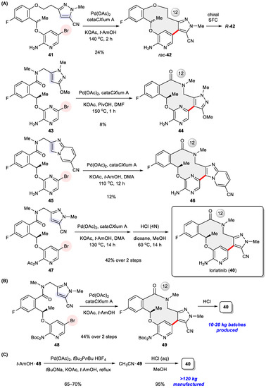 The medicinal chemistry route culminating in 40 required the preparation of diverse 12- to 14-membered macrocycles holding one stereogenic center and three (hetero)aromatic rings. These rigidifying elements make their synthesis a nontrivial task, particularly in view of their close resemblance to synthetically more demanding medium-sized (8- to 11-membered) rings compared with larger (≥15 membered) macrocycles [59]. Intramolecular Heck arylation [6,60], as testified through the successful assembly of numerous 5- and 6-membered rings [61,62,63,64,65,66,67,68,69,70,71], turned out to be indispensable to access macrocyclic (R)-42, 44, 46, and 40 during the initial drug discovery campaign (Figure 7A) [55]. Subsequently, this synthetic approach was implemented to produce radiolabeled isotopologues for positron emission tomography (PET) imaging [72]. Crucial to this ring-closing transformation is the addition of di-1-adamantyl-n-butylphosphine (cataCXium®A) [73] to promote Pd-catalyzed arylation. In preclinical studies, an exploratory scale-up route was initially reported, relying on amidation to close the macrolactam ring [74]. However, safety concerns over the large-scale use of high-energy condensation reagent HATU prompted Pfizer chemists to work out a second-generation process synthesis through the intermediates 48 and 49 (Figure 7B), in this way delivering 10–20 kg batches of the drug for clinical investigation [75]. To avoid the use of proprietary cataCXium®A, an alternative ligand di(n-butyl)-t-butylphosphine was employed in the form of an air-stable HBF4 salt. The endgame of the commercial route features an efficient intramolecular Heck arylation of crystalline 48 t-amyl alcohol to yield another crystalline solvate, 49 acetonitrile, in 65–70% yields, followed by acidic deprotection so as to manufacture the API at a >120 kg scale for the time being (Figure 7C) [75]. It is worth noting that intramolecular Suzuki coupling had been evaluated in parallel throughout the process optimization study, but poor yields were achieved even after extensive screening of multiple reaction parameters and, accordingly, its applicability was ruled out.