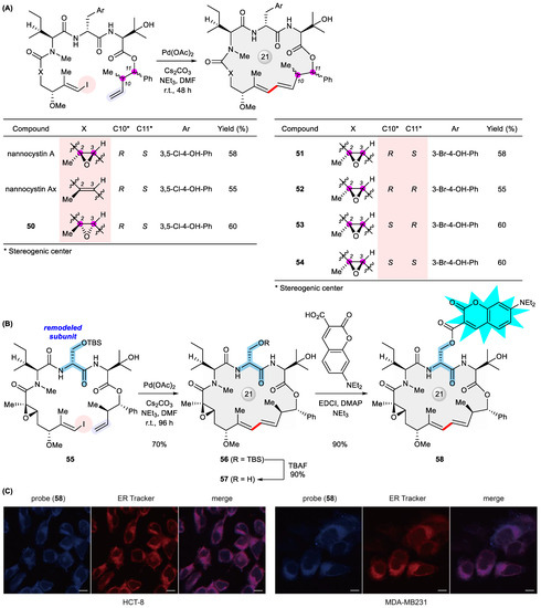 In a broad sense, natural product analogues should contain those initially targeted for total synthesis but only found later to be misassigned structures, a serendipitous twist alluding to the charm of natural product research. Pertaining to the title reaction, the synthesized nominal structures of diazonamide A [76], kulkenon [77], the aglycone of mandelalide A [78], and maltepolide C [79] belong to this category. More often though, analogues of structurally validated natural products are prepared deliberately, rather than unexpectedly, in order to explore biologically relevant chemical space, wherein Heck macrocyclization again plays a substantial role. Earlier examples include conformationally restricted taxoids [80], side chain derivatives of mandelalide A [81], and stereodivergent solomonamides [82]. Recently, our total synthesis of highly antiproliferative nannocystin A through Heck macrocyclization [83,84] secured subsequent SAR investigations by facilely preparing dozens of non-natural analogues including 50–54 that deviate from the natural lead either stereochemically, along the macrocycle backbone, or at the peripheral substituent (Figure 8A) [85,86,87,88]. Aiming at site-directed late-stage diversification for quickly exploring chemical space around the nannocystin framework [89], we next remodeled its macrocycle composition in which a homochiral serine (highlighted in the structure) has been substituted for the innate D-serine to give the macrocyclic alcohol 57. To our satisfaction, the precursor 55 underwent smooth ring closure in a 70% yield under Heck coupling conditions, TBS deprotection then furnishing 57 ready for divergent post-macrocyclization esterification (Figure 8B) [90]. Although nannocystin A was shown to be a specific inhibitor of eukaryotic elongation factor 1A (eEF1A) [91], its exact anticancer mode of action awaits further elucidation [92]. Informed by thus obtained SAR and pursuing a nannocystin-based fluorescent probe [93], we designed and synthesized a coumarin conjugate 58 with good cell permeability. It was observed by means of confocal fluorescent microscopy that this probe is localized predominantly to the endoplasmic reticulum (Figure 8C), most likely acting upon its target eEF1A at the ER-bound ribosome [90]. Interestingly, our result is in good agreement with a recent work that visualized eEF1A associated with the ribosome on the ER membrane at molecular resolution by the use of cryo-electron tomography [94], thereby shedding light on the intracellular mode of action of nannocystins.