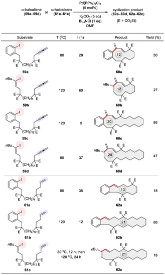 An interesting Heck-type cyclic carbopalladation was reported by Ma and Negishi in 1995, employing allenes as the alkenyl coupling partner, thereby producing carbocycles of varying sizes including macrocycles [95]. This work was based on their earlier discovery of facile access to 7- and 8-membered rings from allene-containing organohalides via Pd catalysis [96]. Substrates pertaining to the subject of this review are given in Figure 9, including ω-iodoallenes 59a–59d and ω-iodoalkenes 61a–61c highlighted at their alkenyl functionalities. Aside from catalytic amount (5 mol%) of Pd(PPh3)2Cl2 and five equivalents of K2CO3, critical to their ring closure are (1) the addition of the phase transfer agent Bu4NCl as pioneered by Jeffery [97] and (2) executing the reaction at reduced concentrations. Despite three possible pathways for carbon–carbon bond formation, the actual cyclization took place invariably at the central allenic carbon with exclusive formation of an exo alkene. The 12- and 20-membered rings 60a–60d were prepared from their allenic precursors 59a–59d in higher yields than the 13- and 21-membered endo macrocycles from their corresponding ω-iodoalkenes (59a vs. 61a, 59c vs. 61b, 59d vs. 61c, Figure 9). Such a superior performance may originate from the cumulated double bonds of allenes, which have gained increasing popularity in organic synthesis [98,99,100,101,102].