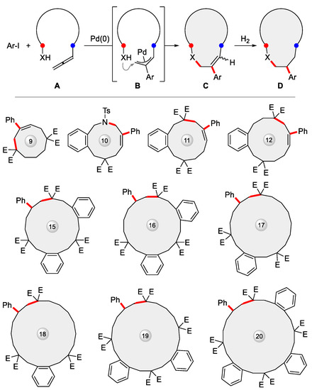 More recently, this methodology was upgraded to embrace intermolecular cyclization between organoiodides and allenes (Figure 10 top), where the allene coupling partner A was equipped distally with an extra nucleophile X so as to self-trap the transient allylpalladium species B generated from initial addition of Ar-Pd-I, resulting in C with high regio- and E/Z stereoselectivity, finally yielding the saturated ring D via Pd/C hydrogenation [103,104]. A variety of unprecedented 9–20-membered rings were prepared via this strategy, as showcased in Figure 10 (bottom).