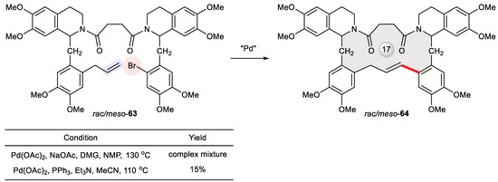 In exploring novel analogues of bisbenzylisoquinoline alkaloids [105], Pyne et al. synthesized laudanosine dimers bound with carbon tethers [106]. Since laudanosine is an active metabolite of the neuromuscular-blocking drugs atracurium and cisatracurium [107], its dimer may have interesting properties. One compound they obtained is macrocyclic 64, deriving from the intramolecular Heck reaction of the acyclic substrate 63. Conventional Heck reaction conditions using Pd(OAc)2, PPh3, and Et3N at 110 °C delivered 64 in a 15% yield, whereas the optimal conditions for the intermolecular Heck reaction of other laudanosine analogues utilizing Pd(OAc)2, NaOAc, N,N-dimethylglycine, and NMP at 130 °C paradoxically resulted in a complex mixture (Figure 11).