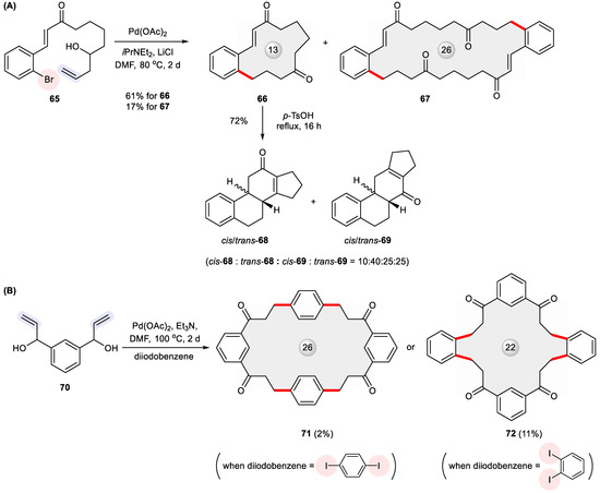 Due to the reversibility of β-hydride elimination, the Heck cross-coupling of allylic and homoallylic alcohols renders carbonyl products through double bond migration [108]. Coupled with other transformations, this reaction can initiate domino processes that give annulated ring systems. Pursuing this goal [109,110,111,112,113], Dyker et al. devised a double transannular cyclization strategy to access the tetracyclic steroid skeleton in the form of isomeric cis/trans-68 and cis/trans-69, which relied on the intramolecular Heck cyclization of allylic alcohol 65 to form the precursor macrocycle 66 (Figure 12) [114]. In addition to 66, a 26-membered macrocycle 67 was isolated in an unneglectable yield of 17%. Intrigued by this finding, the authors performed a follow-up study to show the opportunity of creating C2v-symmetric macrocycles 71 and 72 through a fourfold Heck reaction with p-diiodobenzene and m-diiodobenzene, respectively [115].