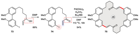 The double Heck cyclization approach was likewise investigated by Harrowven et al. for macrocycle synthesis [116]. Because the formation of a biphenyl-embedded 13-membered ring from 73 is likely to experience significant strain, as encountered in an independent study before [117], the authors envisioned that such an energetically disfavored process would be surpassed by the closure of a relaxed dimeric 26-membered ring (Figure 13). Nevertheless, the initial precursor 73 failed to cyclize under Pd(0) catalysis; a mixture of polar by-products were detected instead, likely as a result of competitive polymerization. The impasse was overcome by oxidizing its allylic alcohol (highlighted in Figure 13) with Dess–Martin periodinane (DMP). The resulting α,β-unsaturated ketone 74 gratifyingly boosted the anticipated intermolecular–intramolecular Heck couplings, affording 75 in a 54% yield. Echoing the preference for dimer formation, recently, an unexpected 26-membered macrocyclic dimer was observed via RCM in an attempted total synthesis of myricanol wherein no mono-cyclization occurred to give a strained 13-membered ring [118].