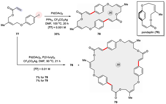 Pondaplin (76) is a strained 13-membered macrocycle because of its rigid 1,4-benzenoid linkage and two built-in Z-alkenes [119]. In an effort to synthesize 76, Joullie et al. explored the intramolecular Heck reaction of the seco precursor 77 but without yielding the target molecule under various conditions (Figure 14) [120]. A serendipitous result from their trials was the formation of the pondaplin dimer 78 in a 38% yield under high dilution conditions (0.001 M). Clearly, high strain energy accrued along the self cross-coupling pathway and as such defied ring closure. As a result, the sequential intermolecular–intramolecular process came into play and generated the dimeric macrocycle. At a 10-fold increased concentration, that is, 0.01 M of 77, a head-to-tail cyclized trimer 79 (7% yield) was isolated along with 78 (7% yield).