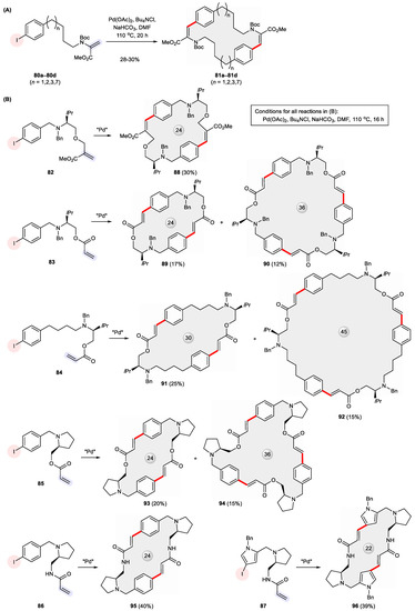 The versatility of multifold Heck-type cross-coupling [121] was demonstrated by Gibson et al. for rapidly preparing a collection of dimeric and trimeric macrocycles from simple starting materials. Both achiral [122,123] and chiral [124,125,126] macrocycles were produced via this strategy. As shown in Figure 15A, achiral cyclophanes possessing two (Z)-dehydrophenylalanine subunits such as 81a–81d arise from the Heck-type head-to-tail dimerization of the corresponding dehydroalanine derivatives 80a–80d, to which p-iodobenzene is attached via a hydrocarbon spacer of different lengths [123]. On the other hand, a variety of bifunctional ω-iodo-1-alkenes 82–87 derived from (S)-valinol (for 82–84) or (S)-prolinol (for 85–87) underwent double and/or triple Heck cross-coupling, giving rise to chiral macrocycles of varying ring sizes, as depicted in Figure 15B [124,125,126].