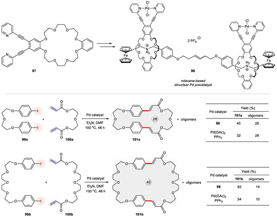 An intriguing case was made by the use of a dinuclear Pd precatalyst 98 mounted onto a rotaxane platform (Figure 16) [127]. This mechanically interlocked supramolecular catalyst was derived from a bidentate N,N ligand 97 containing a crown ether motif so that two Pd-complexed macrocycles could be threaded through a confining α,ω-bisferrocenyl shaft. Its catalytic performance was compared with the standard Pd(OAc)2/PPh3 system in the Heck cross-coupling of two pairs of bifunctional substrates, namely (1) 99a, 100a and (2) 99b, 100b. While both reactions suffered from competing oligomerization, the rotaxane-based catalyst 98 produced higher yields of the macrocycles 101a and 101b relative to oligomers than the discrete Pd species.