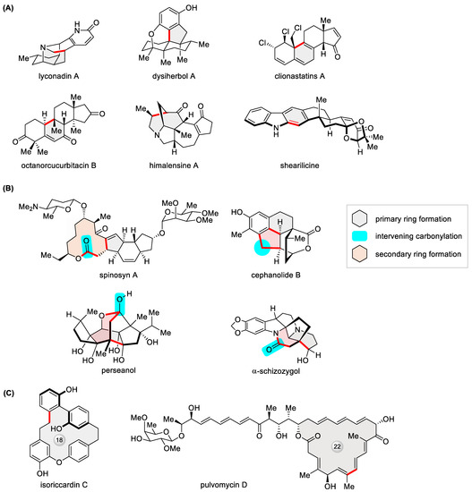In contrast to alternative Pd-catalyzed macrocyclization reactions [11], an appealing facet of the Heck reaction lies in the fact that there is no prerequisite for a heteroatom-functionalized alkene coupling partner. Hence, it is an apt embodiment of the KISS (keep it simple …) principle with regard to atom economy. The absence of a directing/activating group, such as a boronic acid moiety, which defines the Suzuki reaction, is prone to engendering ambiguous regio- and stereoselectivity, an issue often challenging intermolecular Heck cross-coupling. Fortunately, such a complication is less seen in intramolecular Heck cyclization. In truth, its relative lack of certainty or predictability compared with other well-practiced cross-coupling processes happens to call for a creative mindset in synthetic design, as elegantly exemplified by the recent total synthesis of polycyclic natural products such as lyconadin A [128], dysiherbol A [129], clionastatins A [130], octanorcucurbitacin B [131], himalensine A [132], and shearilicine [133] (Figure 17A). When coupled to carbonylation with the one-carbon feedstock CO, the intramolecular Heck reaction offers the opportunity to generate two consecutive rings in a one-pot cascade [134]. As illustrated in Figure 17B, Pd-catalyzed carbonylative Heck-type macrolactonization, C-H functionalization, lactonization, and lactamization have inspiringly led to the total synthesis of spinosyn A [135], cephanolides B [136], perseanol [137], and α-schizozygol [138], respectively. With regard to large rings, shortly after a 2021 review [12], more progress was made in the total synthesis of isoriccardin C [139], pulvomycin D (Figure 17C) [140], and the (2E) isomer of macrolactin 3 [141].