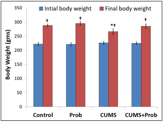 Change in the body weight of rats exposed to chronic unpredictable mild stress (CUMS) for 28 days with or without daily supplementation with a probiotic (Prob) mixture. Results are mean ± SEM of 6 rats per group. † indicates a significant difference (p < 0.05) compared to initial body weight, * indicates a significant difference (p < 0.05) of CUMS from the control and probiotic (Prob) group; one-way ANOVA followed by Tukey’s post hoc test.