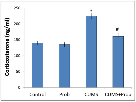 Daily supplementation with the probiotic mixture improved plasma corticosterone levels in rats exposed to chronic unpredictable mild stress (CUMS) for 28 days. The values are mean ± S.E.M (n = 6). * indicates a significant difference (p < 0.001) of CUMS from the control and probiotic (Prob) group, # indicates a significant difference (p < 0.01) of CUMS+Prob from CUMS group; one-way ANOVA followed by Tukey’s post hoc test.