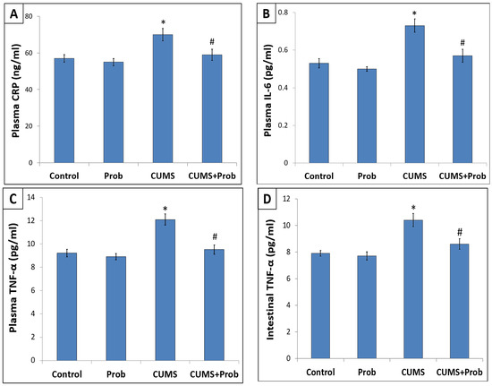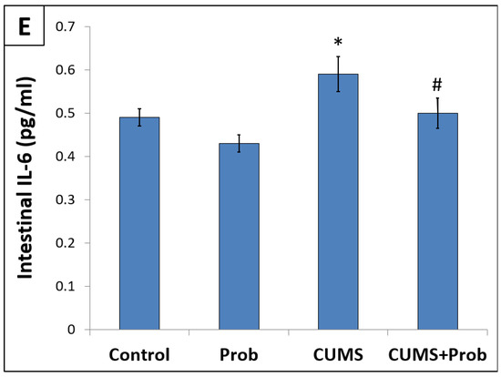 Figure 3 shows the levels of inflammatory markers in control and CUMS-exposed rats, with or without supplementation with a probiotic mixture. Plasma CRP, an acute-phase protein, is commonly used as a potential indicator of systemic inflammation. The stressed rats showed a significant (p < 0.01) increase in plasma CRP level compared with the control group (Figure 3A). Moreover, exposure to CUMS showed significantly increased (p < 0.01) levels of the inflammatory cytokines TNF-α and IL-6 in plasma (Figure 3B,C) and intestinal tissue homogenates compared to the control group (Figure 3D,E). However, compared with the CUMS-exposed group, rats receiving the probiotic mixture daily during CUMS exposure showed significant attenuation (p < 0.05) of inflammatory markers in plasma and intestine.