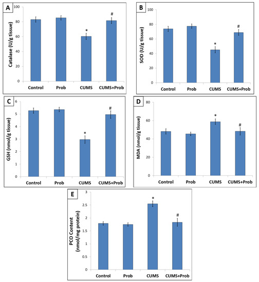 The effect of probiotics supplementation on (A): Catalase activity, (B): Superoxide dismutase (SOD) activity, (C): Reduced glutathione content, (D): Malondialdehyde (MDA) level, and (E): Protein carbonyl (PCO) content in the intestine of the rats exposed to CUMS for 28 days. The values are mean ± S.E.M (n = 6). * indicates a significant difference (p < 0.01) of CUMS from the control and probiotic (Prob) group, # indicates a significant difference (p < 0.01) of CUMS+Prob from CUMS group; one-way ANOVA followed by Tukey’s post hoc test.