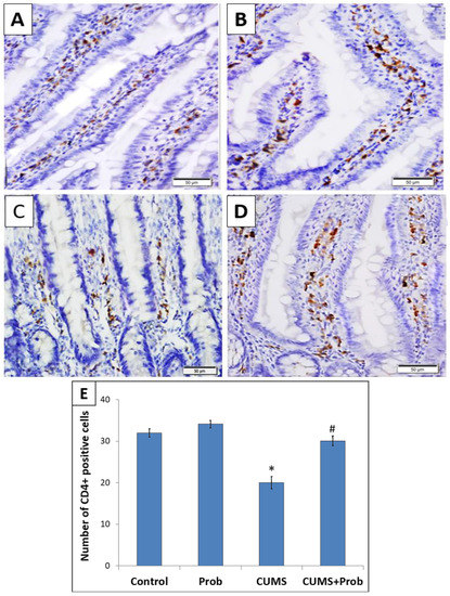 The effect of probiotics supplementation on the expression of CD-4+ T-lymphocytes in the intestine of (A): control, (B): probiotics (Prob)-supplemented group; (C): chronic unpredictable mild stress (CUMS)-exposed group, and (D): CUMS+Prob group. Scale bar 50, magnification 400×. (E). Bar graph showing the relative number of CD-4+ positive cells in the intestine of rats exposed to CUMS with or without probiotics supplementation. Each CD4+T-lymphocyte stained section by the positive cells was counted manually in 20 random fields at a magnification of 400×. * indicates a significant difference (p < 0.001) of CUMS from the control and probiotics (Prob) group, # indicates a significant difference (p < 0.001) of CUMS+Prob from CUMS group; one-way ANOVA followed by Tukey’s post hoc test.