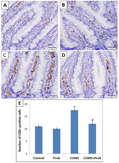The effect of probiotics supplementation on the expression of CD-8+ T -lymphocytes in the intestine of (A): control, (B): probiotics (Prob)-supplemented group; (C): chronic unpredictable mild stress (CUMS) exposed group, and (D): CUMS+Prob group. Scale bar 50 µm, magnification 400×. (E). Bar graph is showing the relative number of CD-8+ T-positive cells in the intestine of rats exposed to CUMS with or without probiotics supplementation. Each CD4+T-lymphocyte stained section by the positive cells was counted manually in 20 random fields at a magnification of 400×. * indicates a significant difference (p < 0.001) of CUMS from the control and probiotics (Prob) group, # indicates a significant difference (p < 0.01) of CUMS+Prob from CUMS group; one-way ANOVA followed by Tukey’s post hoc test.