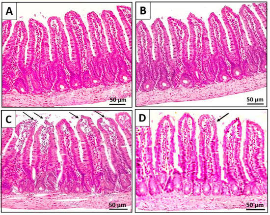 Small intestinal segments from each group were fixed in neutral buffered formalin solution (10%) and embedded in paraffin wax. Approximately 4–5 µm sections of the paraffin blocks were sliced and stained with hematoxylin and eosin. After, a cover slip was gently placed over the stained sections. Finally, all slides were analyzed using an optical microscope (Eclipse 50i; Nikon, Minato, Tokyo, Japan).