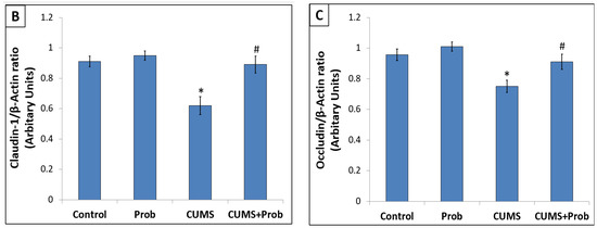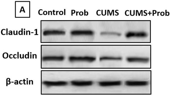 An important determinant of intestinal function is barrier integrity, which is determined by tight junction proteins. When compared to the control group, rats exposed to CUMS had decreased expression levels of occludin and claudin-1 proteins in the intestinal mucosa. However, compared to CUMS-exposed rats, the CUMS+Prob group showed increased occludin and claudin-1 protein expression levels (Figure 9).