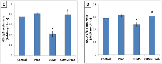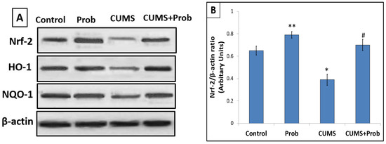 Figure 10 shows the expression of Nrf-2 signaling pathway-related proteins in the control group and the rats exposed to CUMS with or without probiotic supplementation. Compared with the control group, exposure to stress significantly (p < 0.01) decreased the protein expression level of Nrf-2, HO-1, and NQO-1 in the intestine. Probiotics supplementation, however, significantly reversed the stress-induced reduction of Nrf-2, HO-1, and NQO-1 protein expression, while the non-stressed probiotics supplemented group showed significantly (p < 0.01) increased Nrf-2 and NQO-1 protein levels in comparison to the control group.