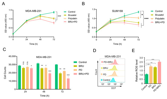 The synergistic effect of BRU and PD inhibited the proliferation of MDA-MB-231 cells and SUM159 cells in vitro and enhanced the reactive oxygen species (ROS) levels of MDA-MB-231 cells. (A,B) MDA-MB-231 cells and SUM159 cells were treated with BRU (20 nM) alone or in combination with PD (100 nM) for 24, 48 and 72 h, and then the cell viability was determined by the CCK-8 method. (C) After treating MDA-MB-231 cells with BRU (20 nM) and PD (100 nM) alone or in combination for 0, 24, 48, and 72 h, Flow cytometer was used to detect the changes in the number of cell proliferation granules of each group in the same volume (400 μL/tube) of cell solution. (D,E) Flow cytometer was used to detect the intracellular ROS levels change by fluorescent indicator H2DCFH-DA after treatment of cells with BRU (20 nM) and PD (100 nM) for 24 h. All results were expressed as the mean ± SD from three independent experiments and the statistical significance was evaluated by two-way ANOVA, n.s. not significant.* p < 0.05, ** p < 0.01, *** p < 0.001.