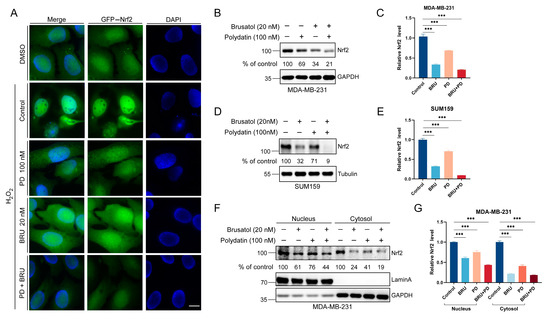 The effect of combining BRU with PD on Nrf2 protein expression in MDA-MB-231 cells and SUM159 cells. (A) The GFP-Nrf2 plasmid was transfected into MDA-MB-231 cells. After the plasmid was expressed for 12 h, it was treated with or without H2O2 100 μM for 4–6 h. Then it was treated with 20 nM BRU alone or in combination with 100 nM PD for 24 h, immunofluorescence staining and observation was performed. Scale bar, 10 μm, (n = 3). (B,C) MDA-MB-231 cells were treated with indicated concentrations of BRU or PD for 24 h and total proteins were extracted for Western blot analysis. The bands were analyzed using the ImageJ software with a grayscale value analysis and statistical analysis by GraphPad Prism 9. (D,E) SUM159 cells were treated with indicated concentrations of BRU or PD alone or in combination for 24 h and total proteins were extracted for Western blot analysis. And bands were analyzed and quantified using ImageJ software and GraphPad Prism 9. (F,G) Nuclear/cytosolic fractionation was performed in MDA-MB-231 cells, and detected the changes of Nrf2 protein levels by Western blot assay, the bands were analyzed using the ImageJ software with a grayscale value analysis and statistical analysis by GraphPad Prism 9. Statistical significance was assessed using One–way ANOVA (n = 3). *** p < 0.001. “–” and “+” indicate whether or not corresponding drug treatments were performed.