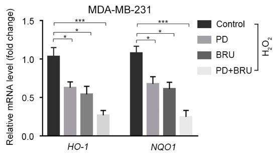 Relative mRNA level changes of Nrf2 downstream target genes HO-1 and NQO1 after BRU+PD treatment in MDA-MB-231 cells. Statistical significance was assessed using two-tailed Student’s t-tests (n = 3). * p < 0.05, *** p < 0.001.