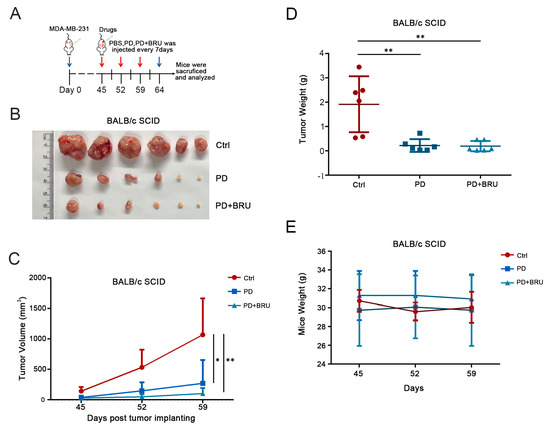 BALB/C nude mice (female, 5 weeks old) were purchased from Zhuhai BesTest Bio-Tech Co., Ltd (Zhuhai, China). BC cells MDA-MB-231 (100 μL containing 5 × 106 cells) were injected subcutaneously into nude mice. Until the tumor volume reached 100–200 mm3, mice in the individual administration groups were injected intraperitoneally with PD 50 mg/kg, the combined administration group was PD 25 mg/kg and BRU 1 mg/kg. Mice in the control group were intraperitoneally injected with PBS (containing 1% DMSO) once every seven days for a total of three times. The mice were monitored for tumor growth, and tumor volume was measured every seven days, and finally, the mice were sacrificed, and the tumor tissues were taken and weighed. The tumor volume was calculated according to the formula (length × width2/2). All animal experiments were undertaken in accordance with relevant guidelines and regulations and were approved by the Institutional Animal Care and Use Committee at SIAT.