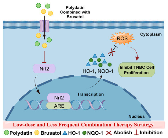 Triple-negative breast cancer (TNBC) has been clearly recognized as a heterogeneous tumor with the worst prognosis among the subtypes of breast cancer (BC). The advent and application of current small-molecule drugs for treating TNBC, as well as other novel inhibitors, among others, have made treatment options for TNBC more selective. However, there are still problems, such as poor patient tolerance, large administration doses, high dosing frequency, and toxic side effects, necessitating the development of more efficient and less toxic treatment strategies. High expression of Nrf2, a vital antioxidant transcription factor, often promotes tumor progression, and it is also one of the most effective targets in BC therapy. We found that in MDA-MB-231 cells and SUM159 cells, brusatol (BRU) combined with polydatin (PD) could significantly inhibit cell proliferation in vitro, significantly downregulate the expression of Nrf2 protein as well as the expression of downstream related target genes Heme Oxygenase-1 (HO-1) and NAD(P)H dehydrogenase, quinone 1 (NQO1), and promote reactive oxygen species (ROS) levels to further strengthen the anti-tumor effect. Furthermore, we discovered in our in vivo experiments that by reducing the drug dosage three times, we could significantly reduce tumor cell growth while avoiding toxic side effects, providing a treatment method with greater clinical application value for TNBC treatment.