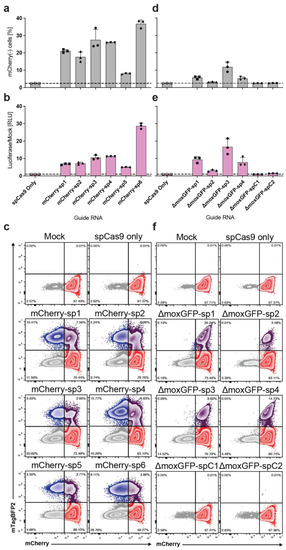 We then selected mCherry-specific spCas9 gRNAs predicted for high-efficiency editing (Figure 1a and Table S1, reporter sites A–C) and multiple overlapping spCas9, saCas9, and Cas12a gRNAs targeting ΔmoxGFP at the deletion site to confirm that editing leads to the anticipated changes in reporter function (Table S1, reporter site D). Two ΔmoxGFP spCas9 gRNAs containing nucleotide mismatches were used as controls (Table S1, reporter site D, mismatches marked in red lower-case).