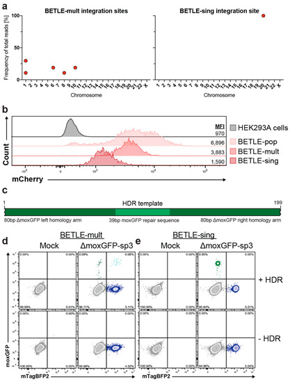 CRISPR/Cas editing in cells with single and multiple BETLE reporter integrants. (a) Single-cell clones BETLE-mult and BETLE-sing were isolated from BETLE-Pop and analyzed for their number of BETLE reporter integrants. (b) mCherry expression in different BETLE reporter cell lines via FACS analysis. (c) Design of a 199 bp HDR template encoding the missing 39 bp of ΔmoxGFP between two 80 bp homology arms. (d) BETLE-mult and (e) BETLE-sing cells were co-transfected with the most-efficient gRNA ΔmoxGFP-sp3 and the HDR template. ΔmoxGFP repair was analyzed via FACS analysis.