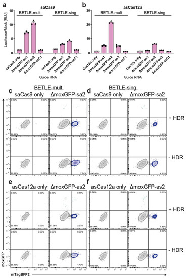 Screening of different Cas endonucleases and gRNAs for editing and HDR efficiency. BETLE-mult and BETLE-sing cells were transfected with plasmids expressing (a) saCas9 or (b) asCas12a and ΔmoxGFP gRNAs. Editing was measured by quantifying NanoLuc luciferase activity. To analyze HDR-mediated target repair with different Cas enzymes, BETLE-mult and BETLE-sing cells were co-transfected with SaCas9 gRNAs and HDR template (c,d) or asCas12a gRNAs and HDR template (e,f). Target repair was analyzed via FACS analysis.