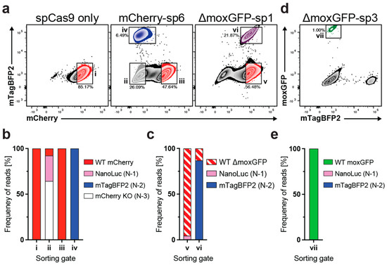 Having shown the successful expression of reporter genes in the N−1 and N−2 ORFs, we next analyzed the targeted DNA sequences in edited cells. Given the challenges of sequencing edited cells with multiple integrants, we focused on BETLE-sing cells. We transfected BETLΕ-sing cells with DNA plasmids expressing spCas9 only or both spCas9 and gRNAs targeting mCherry or ΔmoxGFP and sorted the edited cells based on their fluorescent profile. While cells transfected with spCas9 only had a single population (i), the cells transfected with gRNA mCherry-sp6 showed three (ii, iii, and iv) distinct populations, and the cells transfected with ΔmoxGFP-sp3 showed two (v and vi) distinct populations (Figure 5a). We then extracted genomic DNA, PCR-amplified the target sites, and sequenced the PCR products.