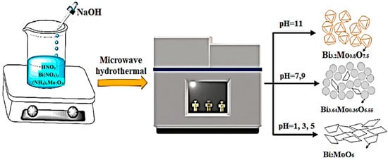The hydrothermal method [] applied under microwave radiation is used to regulate the morphology of materials to obtain excellent physical and chemical properties. Recently, it has been shown that this method is well suited for the synthesis of molybdates []. In this work, six different bismuth molybdate-based catalysts were investigated and synthesized by a fast hydrothermal method using microwave irradiation under different pH conditions. By adjusting the pH value during preparation, the morphology and structure of the synthesized catalysts can be modified as well as the transition of Bi2MoO6 crystals to Bi3.2Mo0.8O7.5, as shown in Figure 2. Crystals can be obtained selectively. The sample prepared at pH 1 showed excellent activity for the oxidation of sulfur compounds in liquid fuel at 60 °C with a hydrogen peroxide to sulfur molar ratio of four, achieving the removal of dibenzothiophene, 4,6−dimethyldibenzothiophene, and benzothiophene with an efficiency reaching 99.71%, 99.68%, and 77.95%, respectively [].