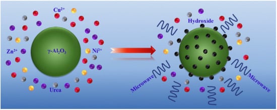 Jing et al. [] produced a copper−based catalyst by thermal hydrolysis of urea using microwave radiation to produce hydrogen from methanol decomposition, as shown in Figure 4. The synthesis of the catalysts was performed in such a way that when the temperature of the solution heated uniformly by microwaves reached 80 °C, the hydroxyl ion could be formed during the decomposition of urea, which could form hydroxides with Cu2+, Ni2+, and Zn2+ on the surface of the carrier γ-Al2O3. It was found that the content of Cu gradually decreased with increasing microwave heating temperature, while the content of Ni and Zn increased with increasing microwave heating temperature, as shown in Table 1. This result is explained by the difference in solubility of metal hydroxides and solution pH. The characterization results show that there is a well-defined correlation between the catalytic characteristics of the catalysts and the microwave heating temperature.