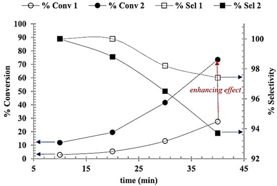In recent years, Iqbal et al. [] have actively studied the catalytic activity of catalysts based on palladium/zirconia in the hydrogenation of cinnamyl aldehyde to cinnamyl alcohol, both in microwave conditions and in an autoclave. The reaction conditions differed slightly: a CEM unit at 1.034 MPa H2, 120 °C, 40 min was used in microwave hydrogenation, and a Parr autoclave applied under the thermal control also included stirring at the speed of 1000 rpm. Thus, a comparison of thermal and microwave hydrogenation under optimized reaction conditions was made. The conversion percentage with microwave irradiation is much higher compared to the conventional heating system. The conversion for both systems increase linearly with time, and the maximum conversions observed for the microwave and pressurized reactor were 73.5% and 27%, respectively, as shown in Figure 5. Thus, the microwave hydrogenation system demonstrates improved performance compared to the conventional pressurized autoclave system.