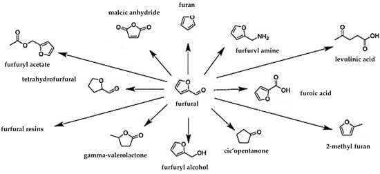 One of the interesting platform chemicals derived from biomass, due to its availability, is furfural. It is used in agrochemistry, perfumery, and plastic production, but it is also applied as a substrate for transformation into value-added products by hydrogenation, oxidation, decarboxylation, and condensation reactions to form furfural derivatives, as shown in Figure 6 [].