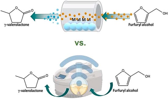 - Lazaro, N.; Ronda-Leal, M.; Pineda, A.; Osman, S.M.; Shokouhimehr, M.; Jang, H.W.; Luque, R. One-pot multi-step synthesis of gamma-valerolactone from furfuryl alcohol: Microwave vs continuous flow reaction studies. Fuel 2023, 334, 126439. [Google Scholar] [CrossRef]