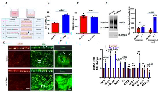 ALI culture increases DRA mRNA and protein expression in Caco-2/BBe cells. (A) A schematic overview of the procedures for creating an ALI culture in intestinal epithelial cells, including TEER measurements. (B) Cell height in Caco-2/BBe cells grown as a submerged culture for 12–14 days (red) or followed by 2-day ALI treatment after 12 days post-confluency (blue). (C) TEER measurements of Caco-/2BBe monolayers from submerged and ALI cultures. Mean ± SEM of n = 3–4 independent experiments shown in B and C. p-values represent unpaired Student’s t-test. (D) Confocal fluorescence microscopy of DRA (green), p-Ezrin (red), and nuclei (white). XZ orthogonal views (upper) and XY projections at the level of the apical membrane (lower). White arrowheads represent small aggregates of DRA-containing structures and red arrowheads represent large aggregates (platforms) of DRA on the apical side of Caco-2/BBe cells. Inserts show expanded areas. Scale bar: 10 µm; insert: 5 µm. (E) Left: IB of DRA and GAPDH of submerged (control) and ALI cultures. Right: densitometric analysis of DRA blots from n = 3 independent experiments separately quantitating DRA upper and lower bands normalized to GAPDH. Results are Means ± SEM. (F) Quantitative real-time PCR analysis of changes in mRNA expression of multiple ion-transport proteins and sucrase-isomaltase. Results are shown as Mean ± SEM of fold change. n = 3–5 independent experiments; NS = nonsignificant; p-values represent unpaired Student’s t-test.