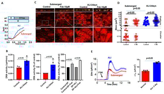 Basal DRA activity, measured by the initial rate of alkalinization that immediately follows the removal of Cl− from the apical HCO3− bathing solution was compared between Caco-2/BBe cells grown as submerged culture or modified as ALI for 2 days. The initial rate of Cl −/HCO3– exchange was significantly increased by ALI (135.0 ± 1.5%) (Figure 3A,B). We recently showed that forskolin acutely stimulates DRA activity, which, in part, involves trafficking to the apical plasma membrane []. Therefore, we compared the responses of forskolin between the submerged and ALI-modified Caco-2/BBe cells. Forskolin (10 μmol/L, 10 min) significantly increased the DRA activity in submerged Caco-2/BBe (127.0 ± 8.1%) cells and caused a non-significantly greater increase in ALI-modified cells (154.0 ± 0.5%). We then investigated if forskolin caused a fusion of DRA into clusters that looked similar to the demonstrated ceramide-rich platforms in human bronchial epithelial cells. Initially, the dimensions of the membrane microdomains that contain DRA were examined and the number of DRA clusters per unit area prior to and following forskolin stimulations was compared. Based on the previous validations and nomenclature, protein-containing membrane areas presenting dimensions close to the limit of the optical resolution (<0.25 µm diameter) were as considered clusters, whereas large aggregates (≥2 µm dia.) were considered as platforms [,]. Quantitation in Caco-2/BBe cells showed that the cells grown in a submerged culture had higher numbers of DRA clusters (<0.25 µm) (average size: 1.2 ± 0.3 µm), compared to 2-day ALI cultures (average size: 4.8 ± 0.3 µm), but presented a much lower number of platforms (≥2 µm) (Figure 3C,D). In the submerged cultures, forskolin resulted in an increase in the number of platforms (average size: 3.0 ± 0.4 µm) and a significant decrease in the number of clusters. In contrast, in Caco-2/BBe cells, following ALI exposure, DRA was only present in the platforms (≥2 µm dia), and the size of the platforms increased further (average size: 6.1 ± 0.4 µm) in response to the forskolin (Figure 3D). We also compared the Fsk-induced short-circuit increase between the submerged and ALI cultures in Caco-2/BBe cells. Similar to the reports on primary human bronchial epithelial cells, there was a significant increase in forskolin-stimulated CFTR activity (Figure 3E) following 2 days of ALI exposure. These results suggest that an increase in the size of DRA-containing clusters in the plasma membrane to form platforms due to ALI may contribute to the increase in basal and forskolin-stimulated DRA activities in these cells.