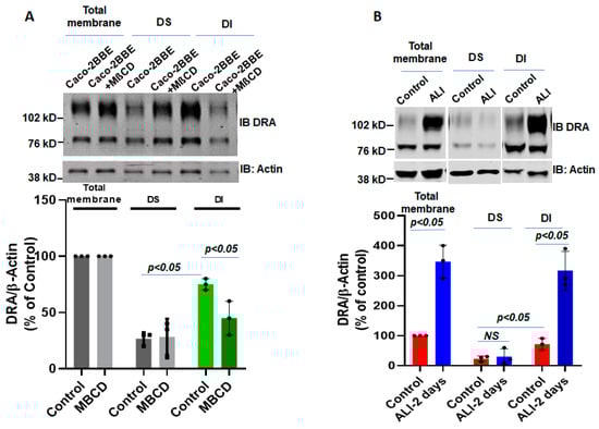 Lipid rafts are enriched with cholesterol and sphingolipids and are resistant to detergent solubilization, such as by Triton X-100; hence, they are included in the detergent-insoluble (DI) membrane fraction []. Since insolubility depends on the cholesterol composition of these microdomains, we determined the effect of methyl-β-cyclodextrin (MβCD) (selectively removes most of the cholesterol from the membrane) on the association of DRA with the DI fraction. Total membrane from DMSO or MβCD (10 µM)-treated submerged Caco-2/BBE cells were incubated with Triton-X 100 at 4 °C and the DI and DS fractions were separated and analyzed using Western blot analysis. As shown in Figure 5A, the DI fraction of the total membrane prepared from Caco-2/BBe cells expresses more DRA compared to the DS fraction under basal conditions. Moreover, the treatment with MβCD caused a significant reduction in the expression of DRA in the DI membrane fraction (Figure 5A). These findings support the previous reports of the presence of DRA in lipid rafts in the total membrane of Caco-2/BBe cells [,]. Whether ALI altered the association of DRA with lipid rafts or the DI fraction of the Caco-2/BBe total membrane was investigated. As shown in Figure 5B, a higher amount of DRA was expressed in the DI compared to the DS fraction of both the submerged (control) and ALI-exposed Caco-2/BBe cells. However, DRA expression in the DI fraction was significantly enhanced in the ALI compared with the submerged culture. These findings suggest that ALI increases the amount of DRA in the lipid raft fraction of the plasma membrane.