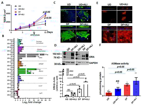 DRA mRNA expression was significantly increased in UD + ALI for 5 days (~2.5-fold vs. UD) and DF (~15-fold vs. UD) monolayers. However, cells from DF + ALI-5days monolayers showed a very high upregulation of DRA mRNA expression (~60-fold vs. UD). The DRA protein expression was also measured using the Western blot analysis of lysates prepared from the colonoids (Figure 6D). The DRA protein expression tracked the changes in mRNA as being significantly increased by DF and DF + ALI conditions, with the greatest change in the DF + ALI condition, an increase compared to the 18-fold UD, while the DRA expression in the DF condition was increased 5-fold vs. UD. UD + ALI caused a slight, but not significant, increase in DRA protein expression. In addition, the apical membrane expression of DRA was increased in all three conditions compared to the UD enteroids, with the greatest increase being in the DF + ALI conditions (Figure 6E). The ASMase activity in cells under the abovementioned four conditions was also determined (Figure 6F). Compared to UD monolayers, which had very low ASMase activity, monolayers from the other three conditions had higher ASMase activities; however, these were only statistically significant for the DF and DF + ALI conditions, with the highest ASMase activity in the DF+ ALI condition (Figure 6F). Overall, these results suggest that exposure of monolayers to ALI enhances the differentiation of colonoids, which is associated with an increase in DRA and ASMase expressions. The increase in differentiation occurred much more frequently in monolayers in which differentiation was initiated by growth factor removal, and the changes were much less frequent in undifferentiated enteroids.