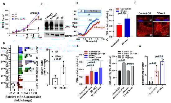 Caco-2/BBe cells are human colon cancer-derived cell lines. To determine whether ALI also affects DRA in normal human intestinal epithelial cells, we used colon-derived normal human intestinal enteroids, also called colonoids (HIEs). When HIEs are differentiated, they include the different epithelial cell types present in the normal intestine, and studies were performed in monolayers of differentiated HIEs because DRA is expressed almost entirely in this population [,,]. The monolayers were initially maintained in the undifferentiated (UD) crypt-like state by growth in Wnt3A, Rspo-1, and Noggin, and for these studies were caused to differentiate (DF) by the withdrawal of growth factors (Wnt3A and Rspo-1) for 5–6 days [,]. DRA expression was compared under four different conditions: (1) UD, (2) UD + ALI—5 days, (3) DF, and (4) DF + ALI—5 days. UD enteroid monolayers from submerged or ALI conditions did not exhibit a significant time-dependent increase in TEER. In contrast, the TEER of the differentiating monolayers from both the submerged and ALI conditions increased significantly and similarly over time (Figure 6A). In these studies, even after 5 days of ALI exposure, colonoid monolayers did not form multilayers, as observed in the Caco-2/BBe cells (Supplementary Figure S1B).