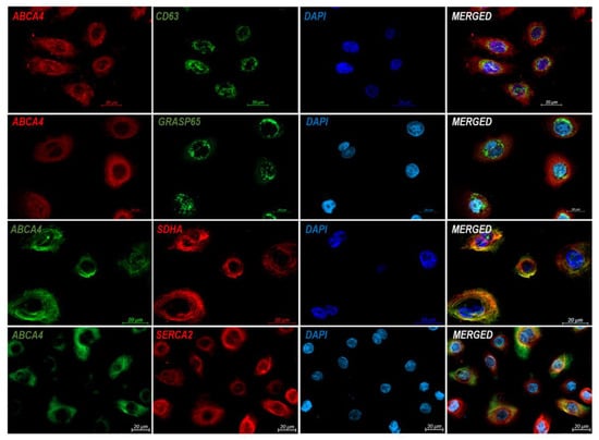 Keratinocyte immunostaining with several markers of cellular components, such as CD63 (lysosome-associated membrane protein 3, lamp3; component of the late endosomal and lysosomal membranes [21]), GRASP65 (Golgi reassembly stacking protein; peripheral protein of Golgi apparatus), SDHA (succinate dehydrogenase complex flavoprotein subunit A; complex of the mitochondrial respiratory chain), and SERCA2 (sarco/endoplasmic reticulum Ca2+-ATPase; protein of the endoplasmic reticulum) revealed variable cytoplasmic expression of the ABCA4 protein. Yellow/orange areas visible on merged pictures in Figure 2 indicate partial correspondence of the ABCA4 protein with the localization of the SERCA2 and SDHA proteins. In contrast, ABCA4 does not co-localize with the CD63 and GRASP65 proteins.