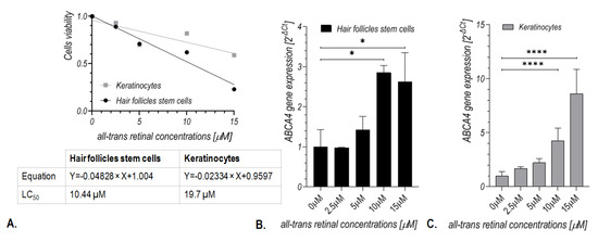 As shown in Figure 3A, an increase in at-RAL concentrations decreased the viability rate of keratinocytes and hair follicle stem cells. Following a 24 h incubation, the half-maximal lethal concentration (LC50) for at-RAL was 10.44 μM and 19.7 µM for hair follicle stem cells and keratinocytes, respectively. ABCA4 gene expression increased in accordance with at-RAL concentrations (2.5, 5, 10, and 15 µM), with a statistically significant difference beginning from 10 µM of at-RAL for both hair follicle stem (Figure 3B) cells and keratinocytes (Figure 3C).