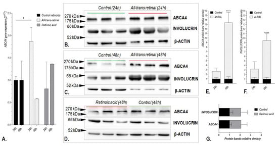 Expression of the ABCA4 gene at mRNA and protein levels after treatment of hair follicle stem cells (HHF-SCs) with vitamin A derivatives: 10 μM all-trans-retinal (at-RAL) and 1 µM retinoic acid. ABCA4 gene expression was assessed by qRT-PCR for HHF-SCs after 24 and 48 h of treatment with vitamin A derivatives (A). * p-value of 0.0157. Analysis of ABCA4 protein expression assessed by Western Blot for HHF-SCs after 24 and 48 h of treatment with 10 μM all-trans-retinal (B,C) and 1 µM retinoic acid (D). Relative densities of Western Blot bands for ABCA4 and Involucrin proteins after 24 and 48 h of treatment of HHF-SCs with 10 μM all-trans-retinal (E,F, respectively) and 1 µM retinoic acid (G). **** p-value < 0.0001.