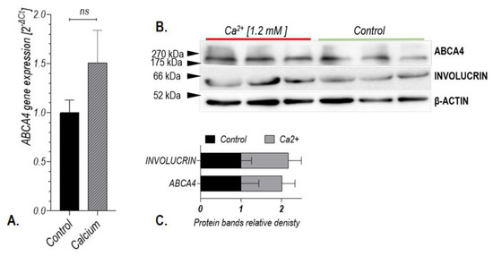 Increased expression of the ABCA4 protein after at-RAL (10 μM) treatment in human hair follicle stem cells positively correlated with the expression of involucrin (Figure 4B,C,F). Treatment of hair follicle stem cells with calcium ions (1.2 µM) for 24 h did not induce ABCA4 gene expression in those cells (Figure 5).