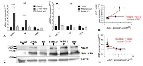 A pronounced induction of ABCA4 mRNA expression was observed in keratinocytes after 24 (Figure 7A) and 48 h (Figure 7B) of treatment with 10 μM at-RAL (p-value < 0.0001 and p-value = 0.005, respectively). An increase was also detected at the protein level after 48 h of treatment with at-RAL (Figure 7C). In contrast, treatment with 1 μM retinoic acid (RA) did not significantly induce ABCA4 gene expression at mRNA (Figure 7A,B) or protein level (Figure 7C). An increased expression of ABCA4 protein after 10 μM at-RAL treatment positively correlated with INV expression in human keratinocytes (Figure 7D) and negatively with expression of the KRT5 gene (Figure 7E).