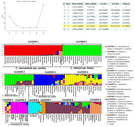 Following STRUCTURE HARVESTER analysis using the 12 SCoT marker data, the 172 accessions were grouped into nine genetic clusters (K = 9) (Figure 1). The genetic structure based on SCoT markers showed clear clustering of citrus species. Overall, each genetic cluster consisted of several species of the genus Citrus. The highest level of homogeneity was observed in the clusters 1, 2, 5, 6, and 7. Interestingly, 40 cultivars of satsuma mandarin (C. × aurantium var. unshiu) were divided into two clusters: cluster 1 (mostly combined new locally derived breeding forms) and cluster 3 (mostly combined old locally derived cultivars). Among them, a set of the genotypes with genetic admixtures was identified, for example, Hybrid 98-9, Clone 31, Sentyabrskii, Olimpiyskii2014, Kodorskii, Kelasurskii, Clone#33, Hybrid 99-4, Clone#22, Izeki Wase, Sochinskii23, Slava Vavilova, or Pioneer80. These genotypes can be an important source of diversity and will be useful for further breeding programs to increase the genetic diversity of mandarins in colder regions. All true lemons (C. × limon var. limon), along with the ancestral species C. medica and its hybrids, comprised the green cluster 2 and all oranges comprised the purple cluster 5. Several genotypes with genetic admixtures of about 10–50% were observed in each of these clusters.